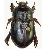This particular Dynastinae is dark brown to black and has a very characteristic plate on the head very finely and transversally wrinkled. The plate is bidentate in malee and emarginated in the females. The convex part of pronotum is strongly and densely punctate; elytra have very weak double rows of fine punctures.