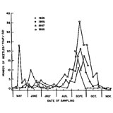 April, or May and disappear in October or November; the specimens mate and feed at twilight and in the dark. The graph below shows the phenology of M.insanabilis in Israel (Bed Dagan) as recorded by balack-light traps in 1985-1988.